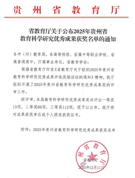 本届贵州省教育科学研究优秀成果奖旨在总结2020年至2024年我省教育科研战线所取得的优秀研究成就。我校获奖团队系贵州省高校思政课优秀教学团队“以文化人:校史文化赋能思政课教学团队”,这也是团队继2023年再次斩获该奖项一等奖,展现我校深入推进“马院+书院”建设的良好成效,彰显学校文化育人工作迈上新台阶。(撰稿:赵小敏;审核|一审:沈洋,二审:上官腾飞,三审:杨清玉)