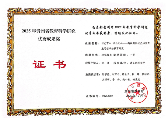 近日,2025年贵州省教育科学研究优秀成果奖评选结果正式公布。我校马克思主义学院党委委员、副院长沈洋副教授领衔完成的研究报告《以史育人以文化人——高校利用校史档案开展思想政治教育研究》荣获一等奖。